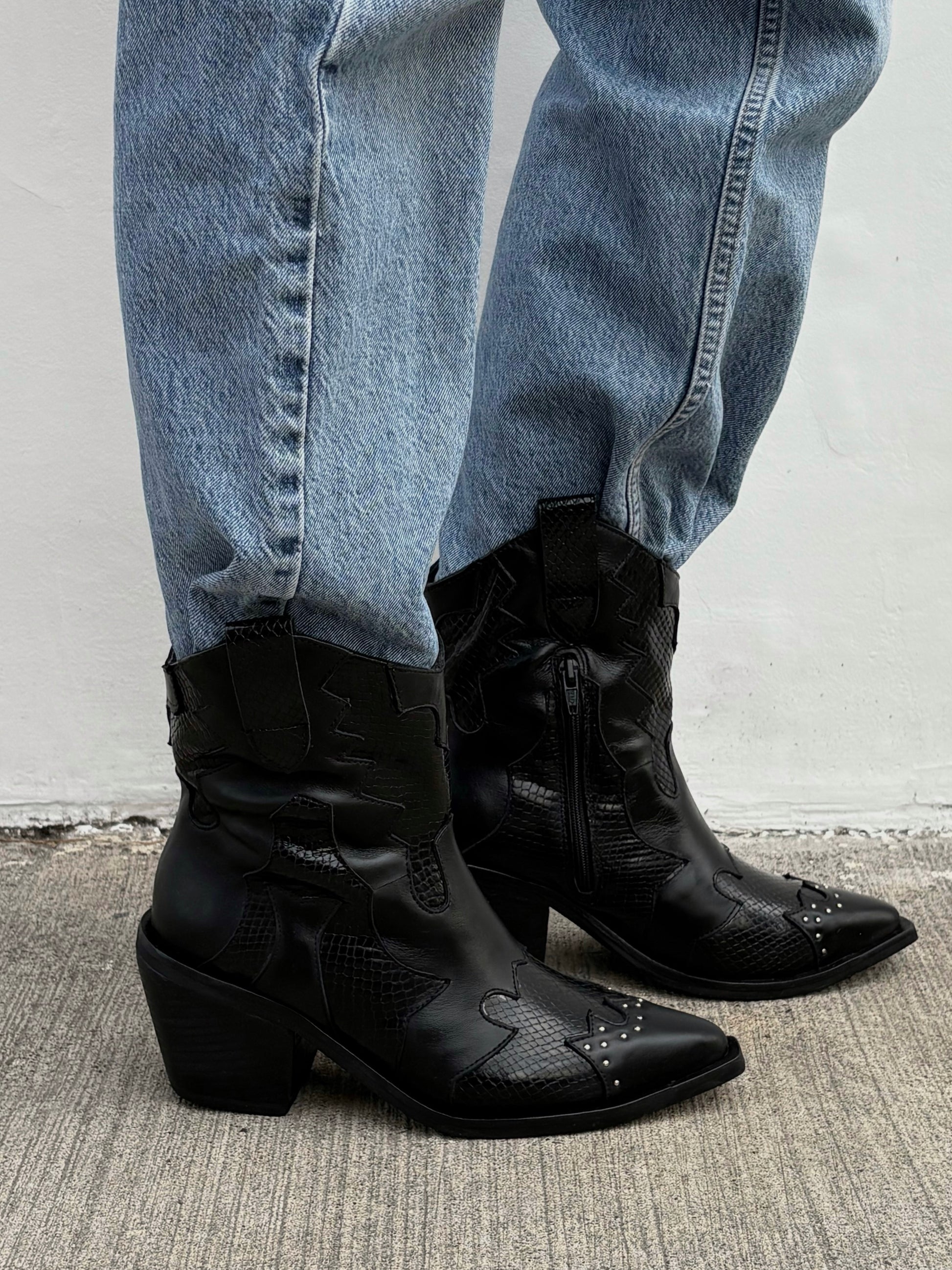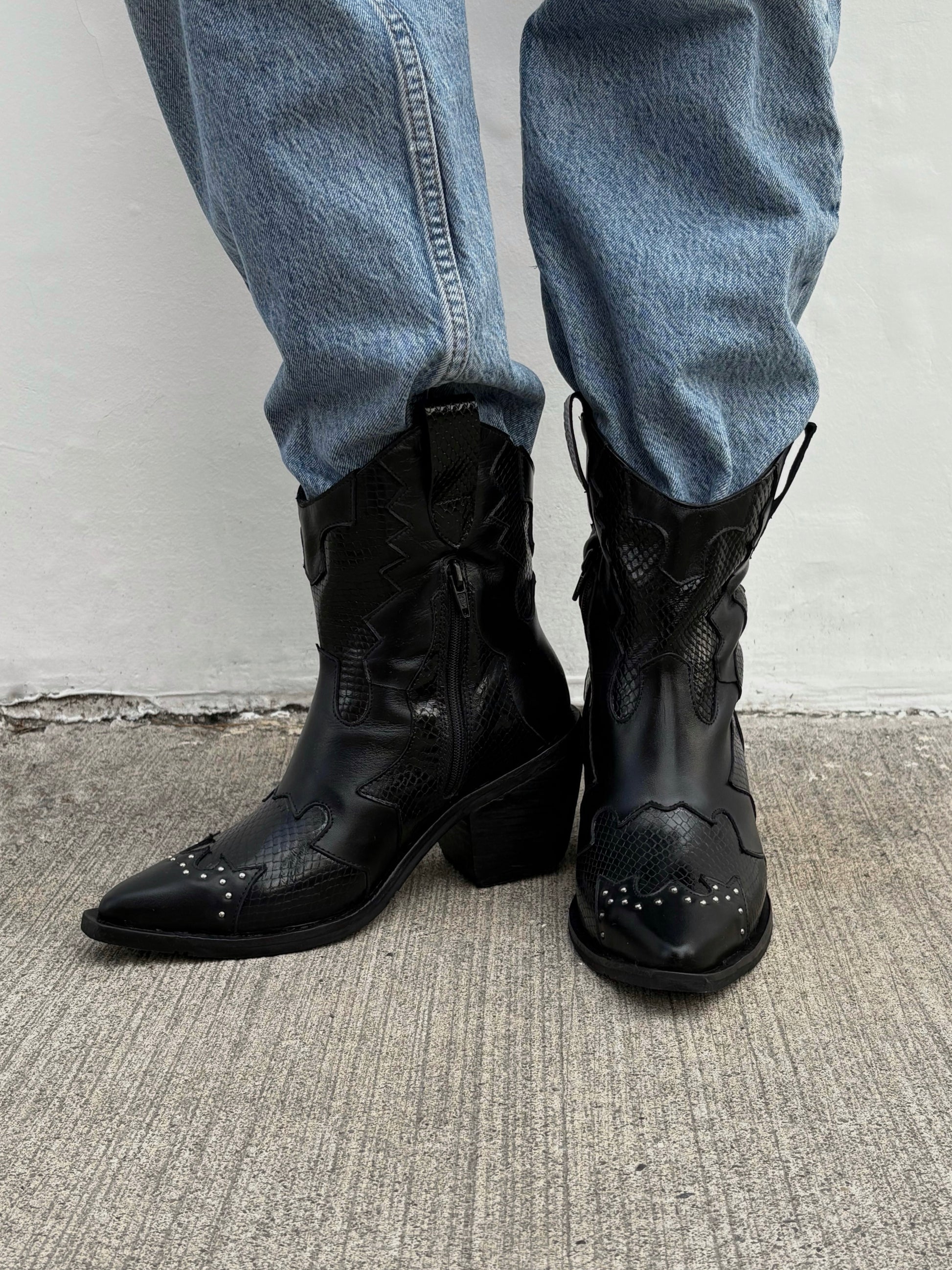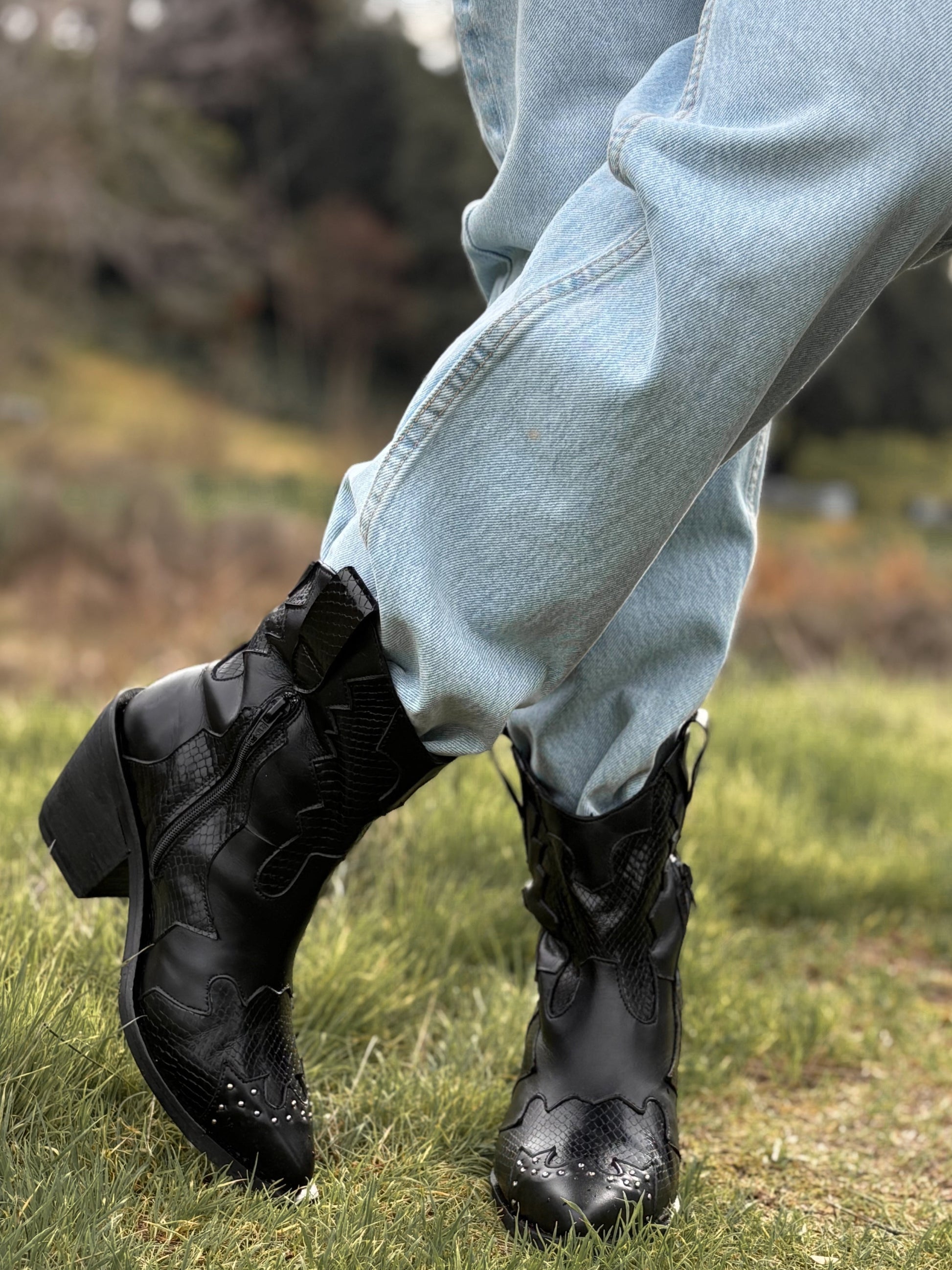 Diseño vaquero con cortes en distintas texturas. Combina un sutil estampado de serpiente con acabado acharolado y cuero liso, creando un contraste único.