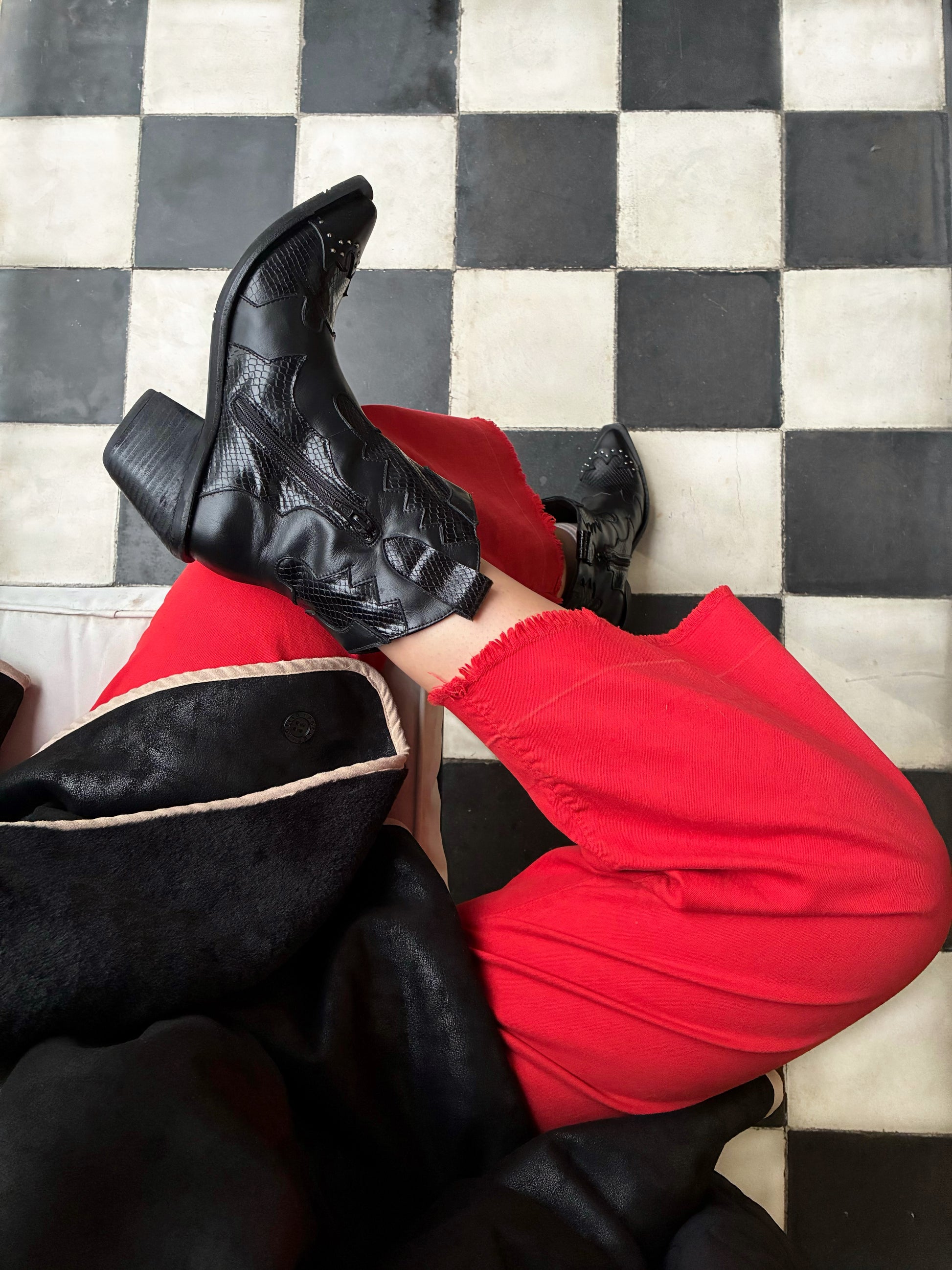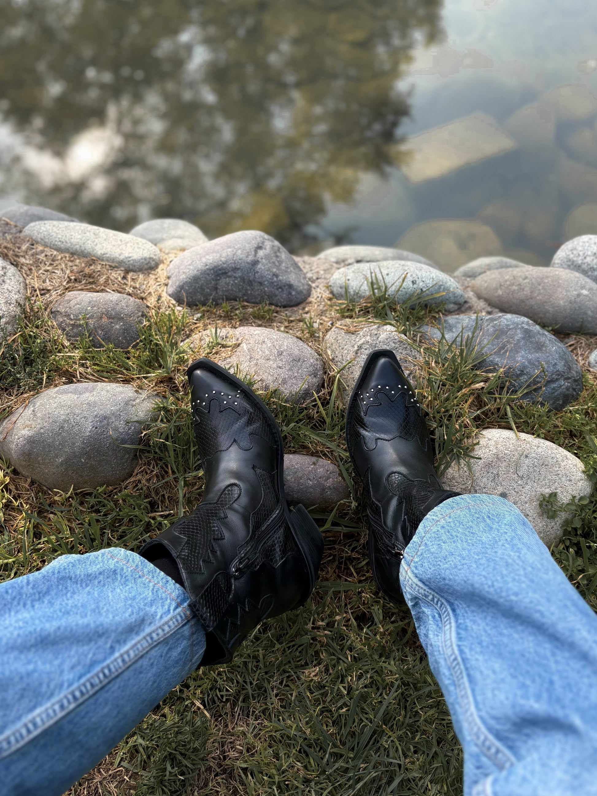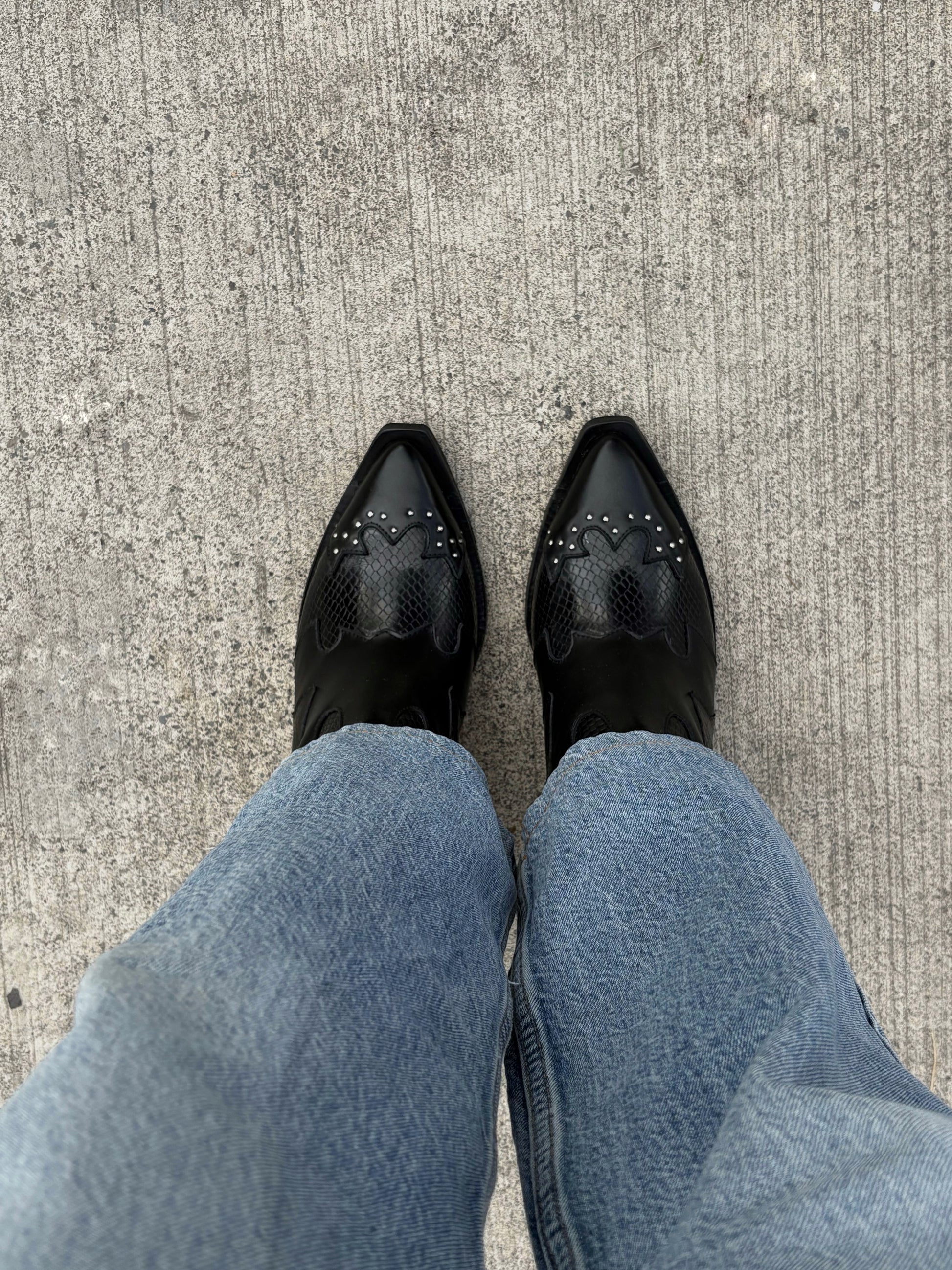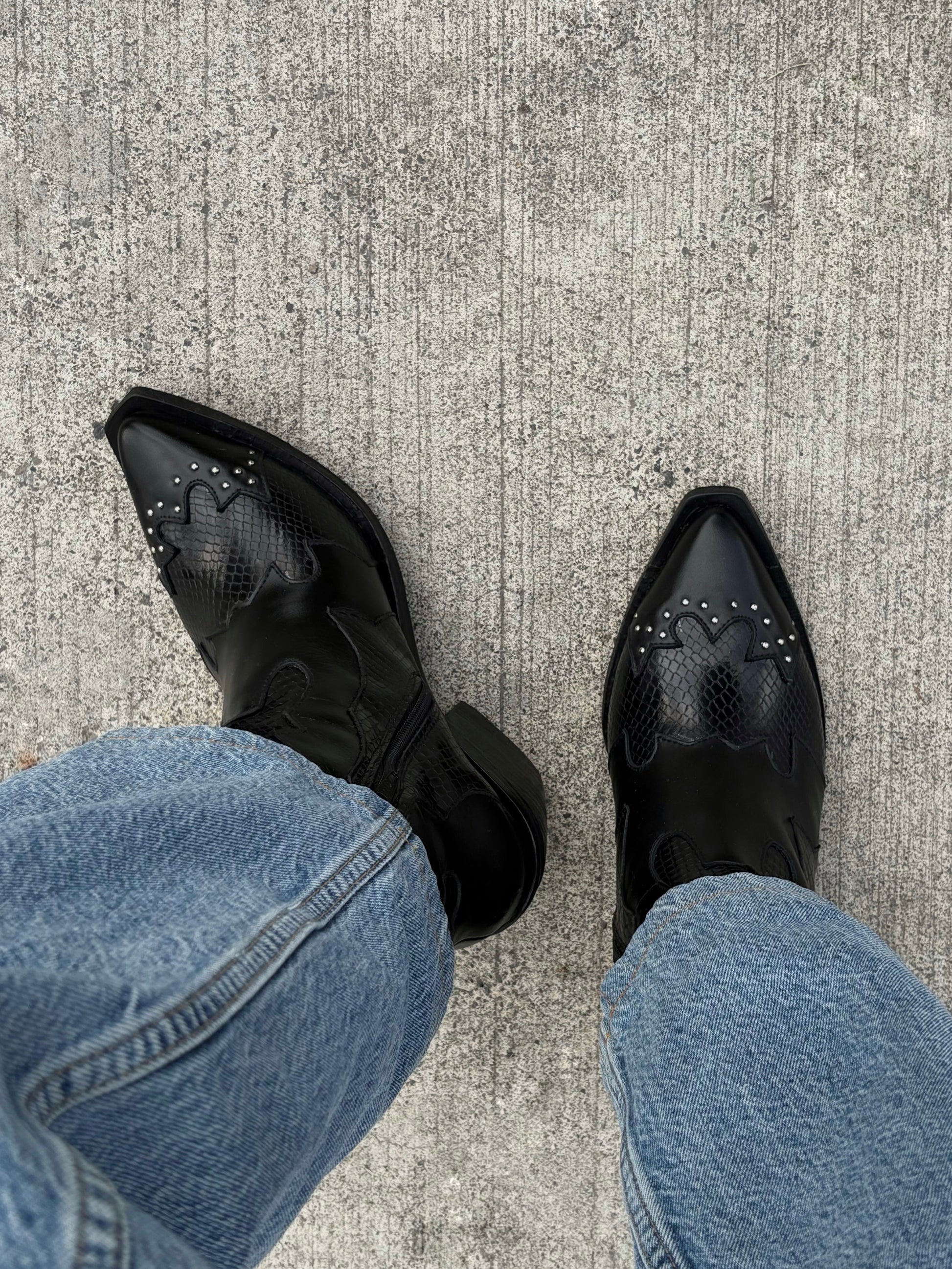 Diseño vaquero con cortes en distintas texturas. Combina un sutil estampado de serpiente con acabado acharolado y cuero liso, creando un contraste único.